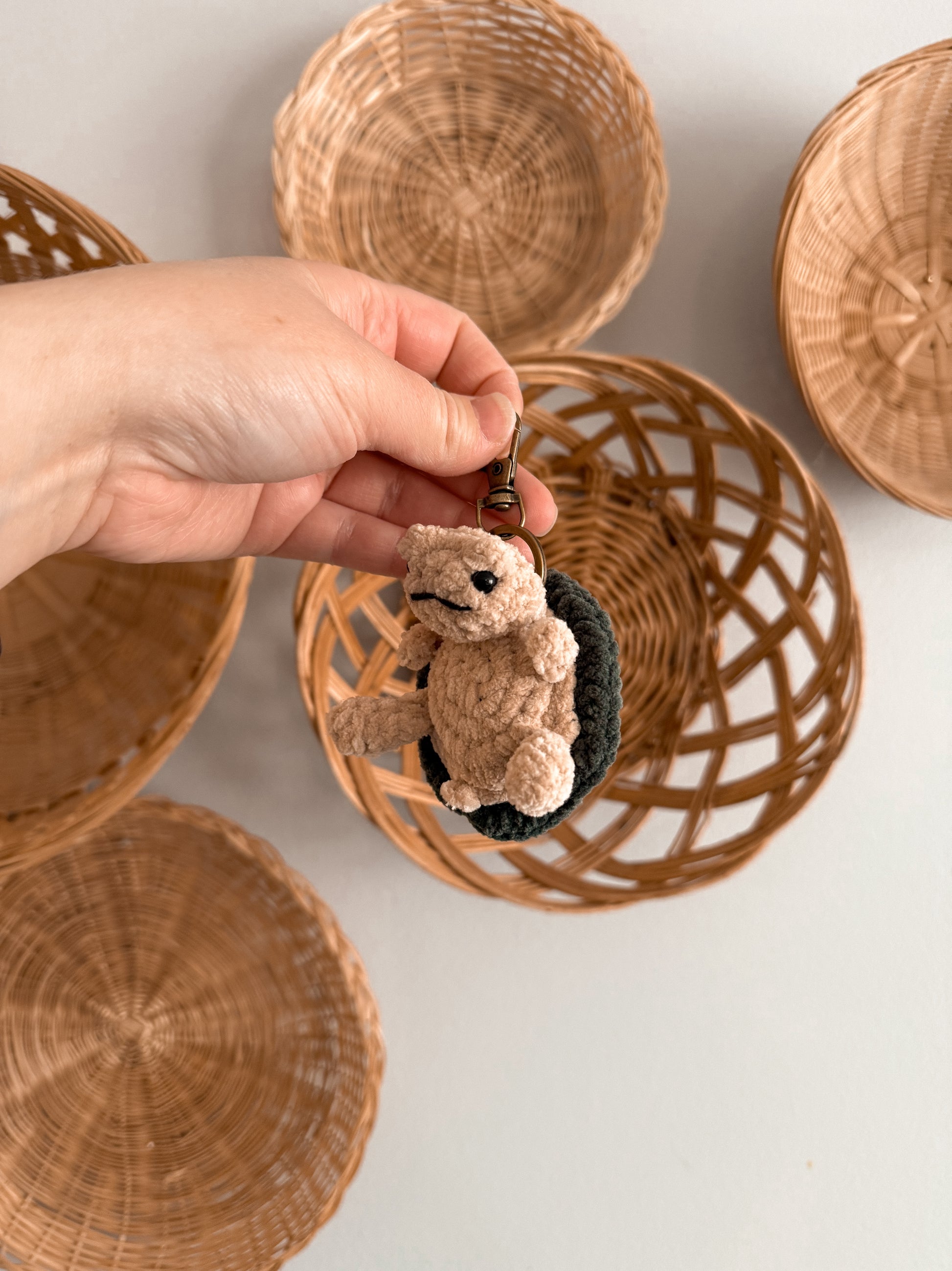 Each plush turtle has its own slightly grumpy expression, giving every keychain a unique personality.